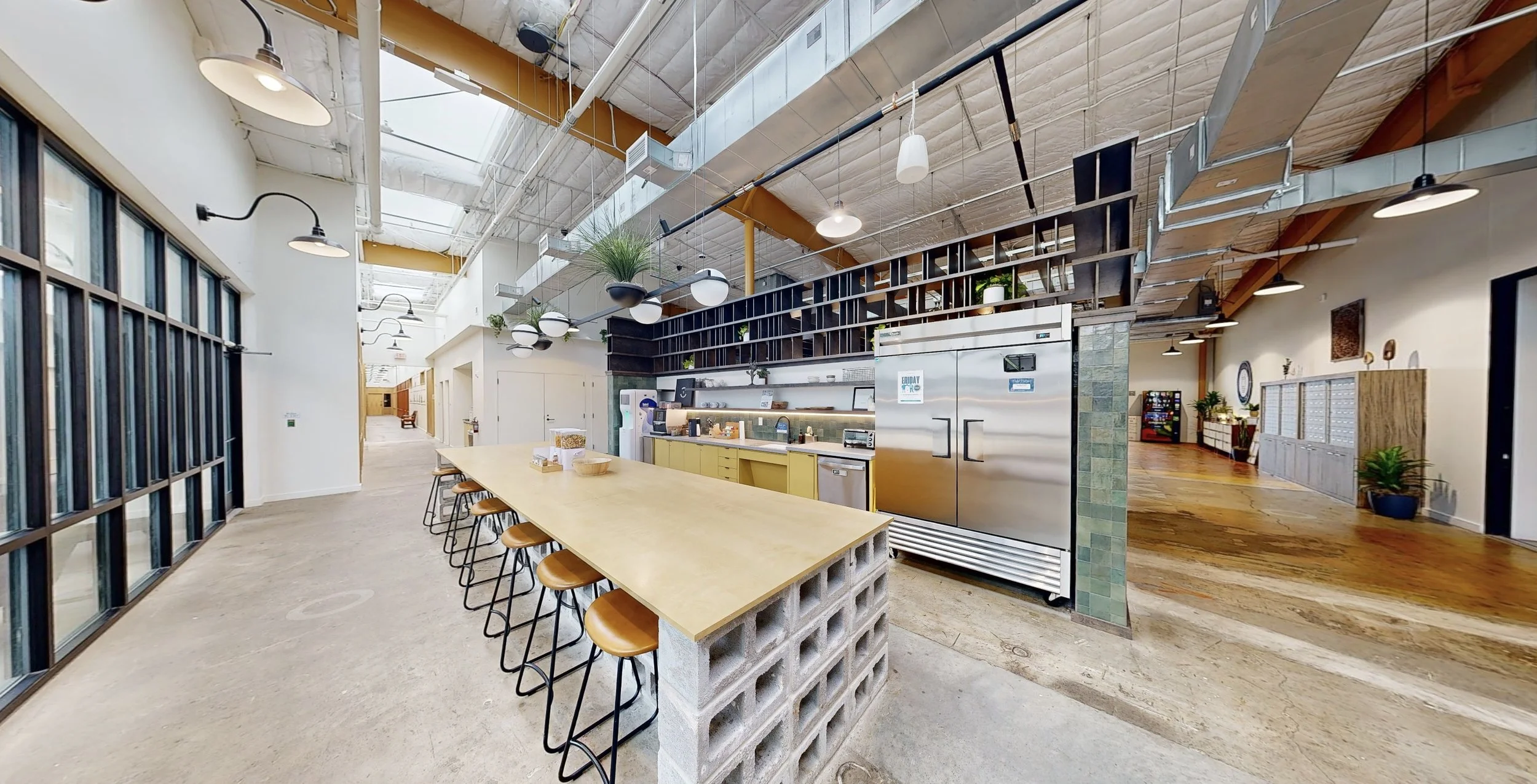 The building’s industrial character was a major draw. Portions of the warehouse feature ceilings reaching roughly 30 feet, creating the opportunity for a light-filled workspace with a clean, modern industrial vibe.